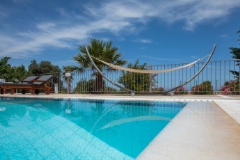 • Private pool measuring 5m x 4.5m with shower, garden furniture, wooden table for 6 people, wooden sun beds with fixed umbrellas and hammock.